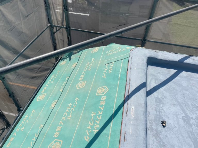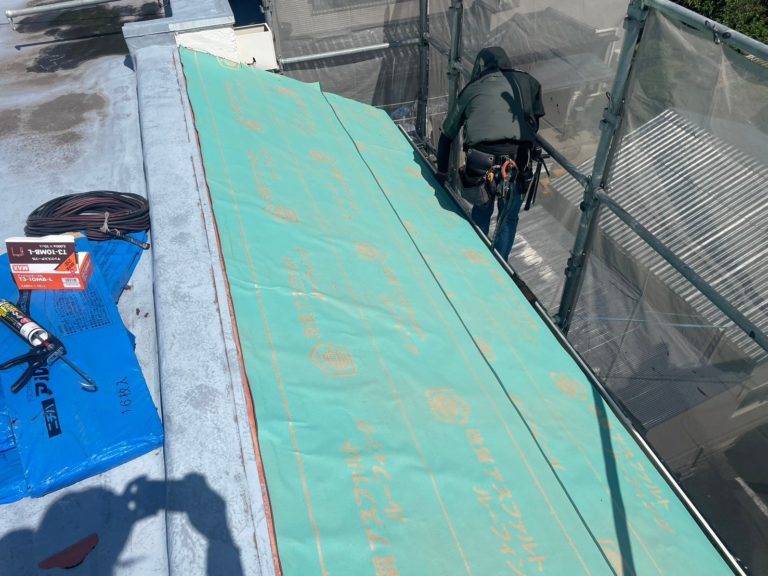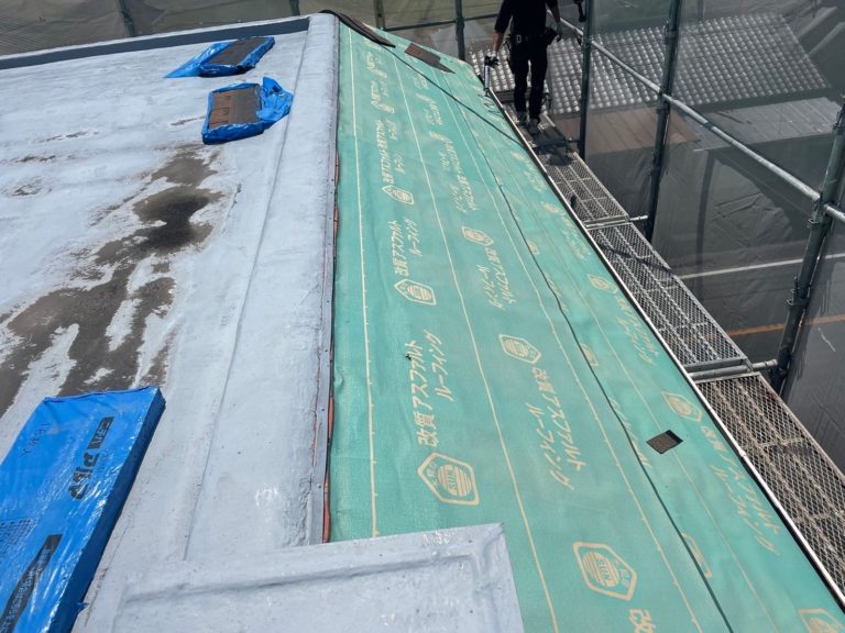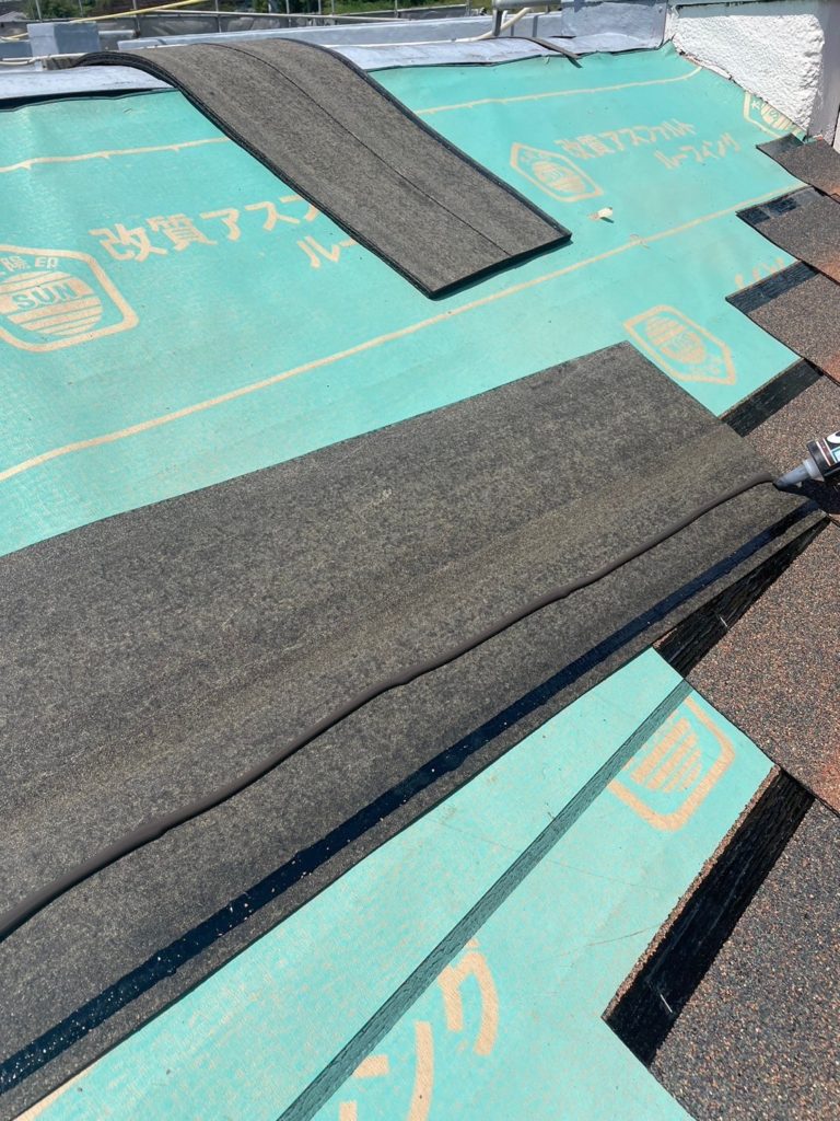 既設改修工事のため、既存の屋根の上からルーフィング(防水紙)を施工しその上からアスファルトシングル葺きというカバー工法での施工となります。