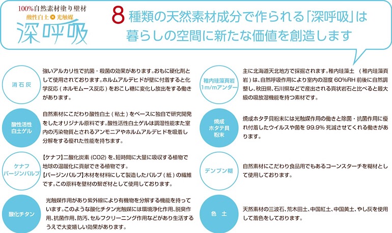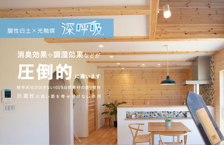 「深呼吸」は100%自然素材を使った塗り壁材で、湿気を調整し、嫌な匂いを吸収する機能を備えています。特に、生活臭やペットの匂いが気になる場所や、子どもが触れる壁にも最適です。大手メーカー製品を超える性能があり、使用することで快適で健康的な環境を保てる点が、多くのご家庭で高く評価されています。