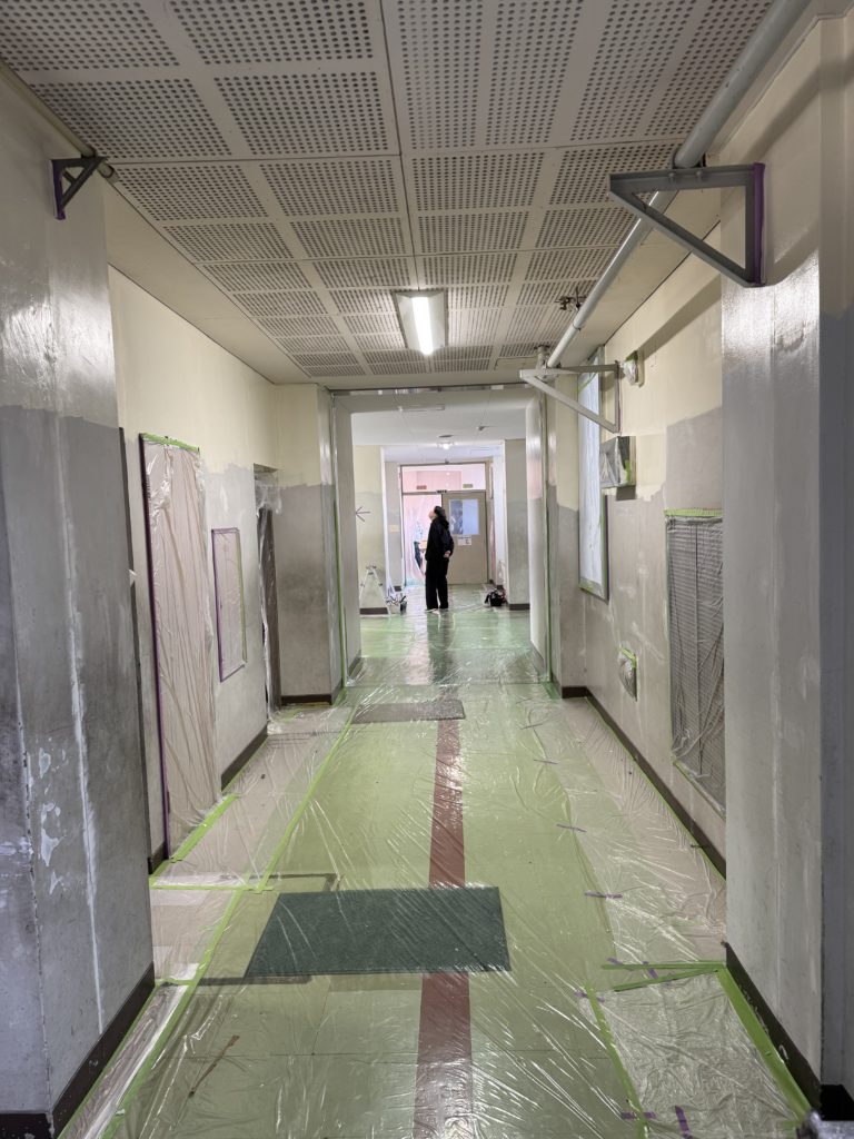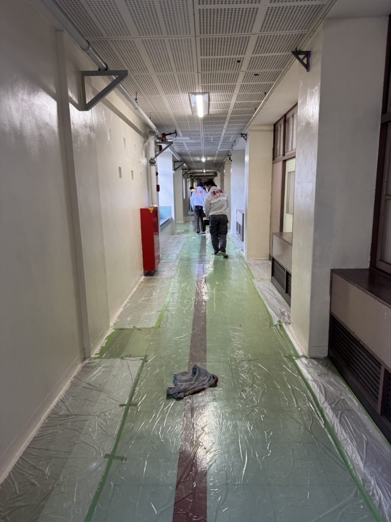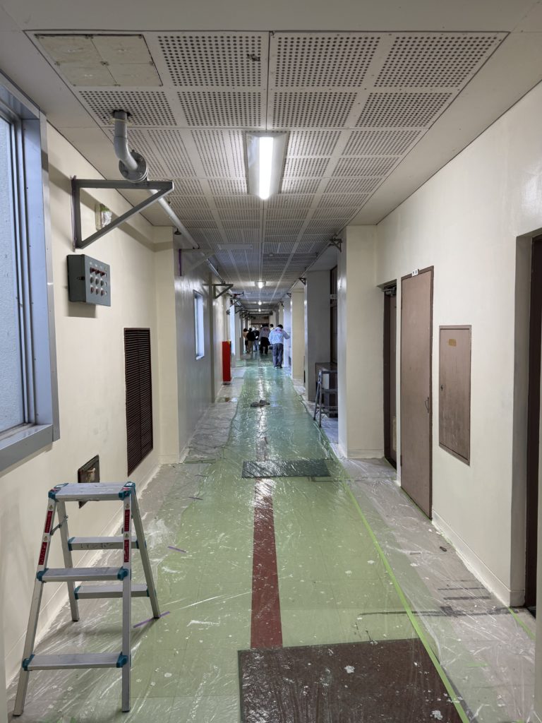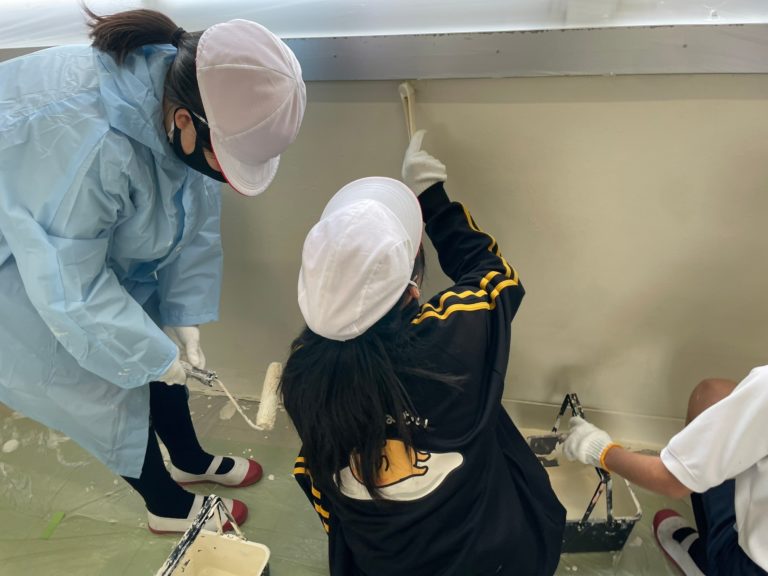 まず、校内の老朽化した壁や天井の状態を確認し、適切な塗料と色を選定。子どもたちが明るい気持ちで過ごせるよう、明るい白色の色合いを採用しました。